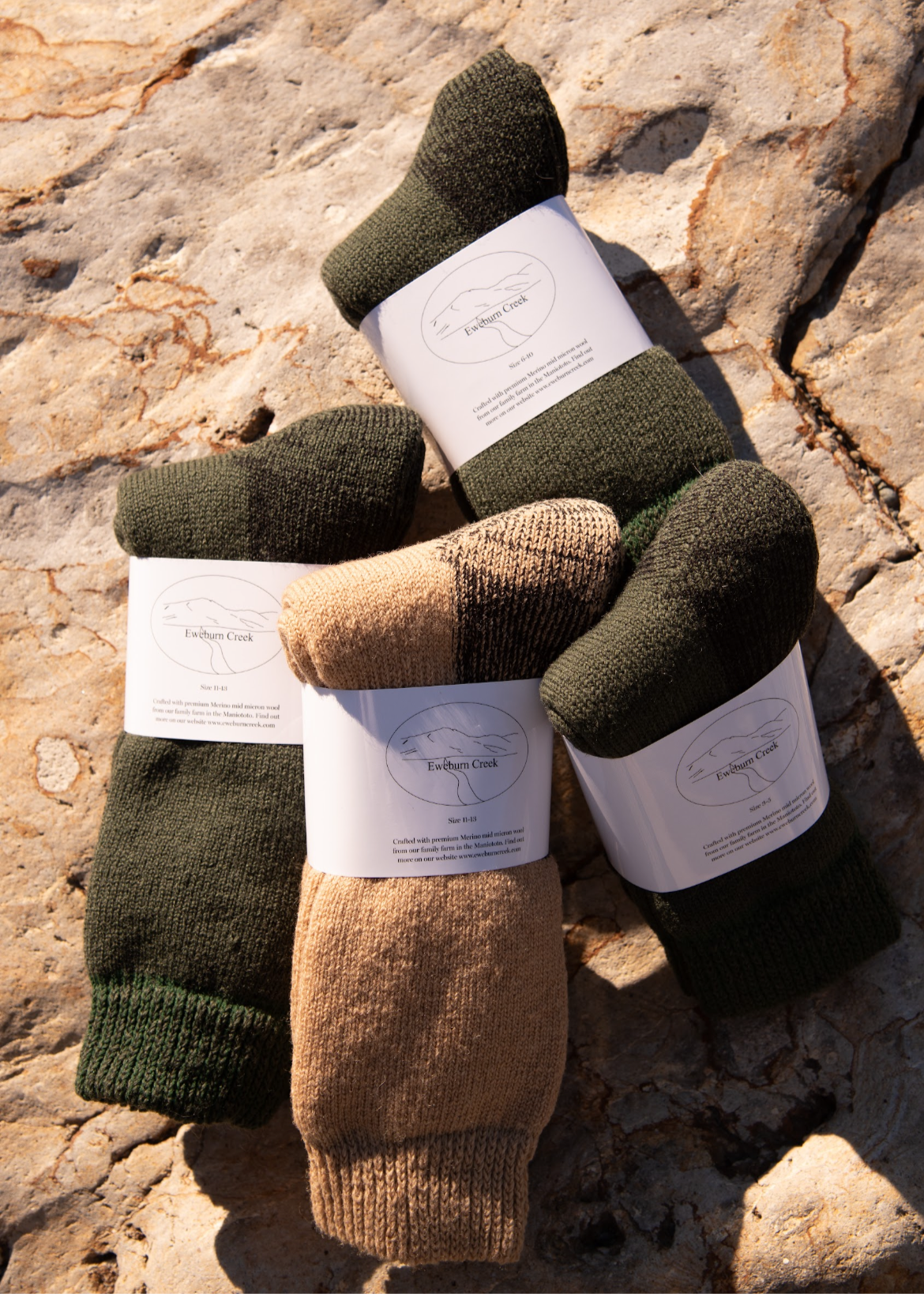 Stay warm this winter—whether you're working on the farm or hiking the trail. These durable, cozy socks are made from wool grown right here on our farm. With 80% natural wool and 20% lycra/nylon for stretch and strength, they’re built to keep your feet comfortable, dry, and toasty in any conditions.